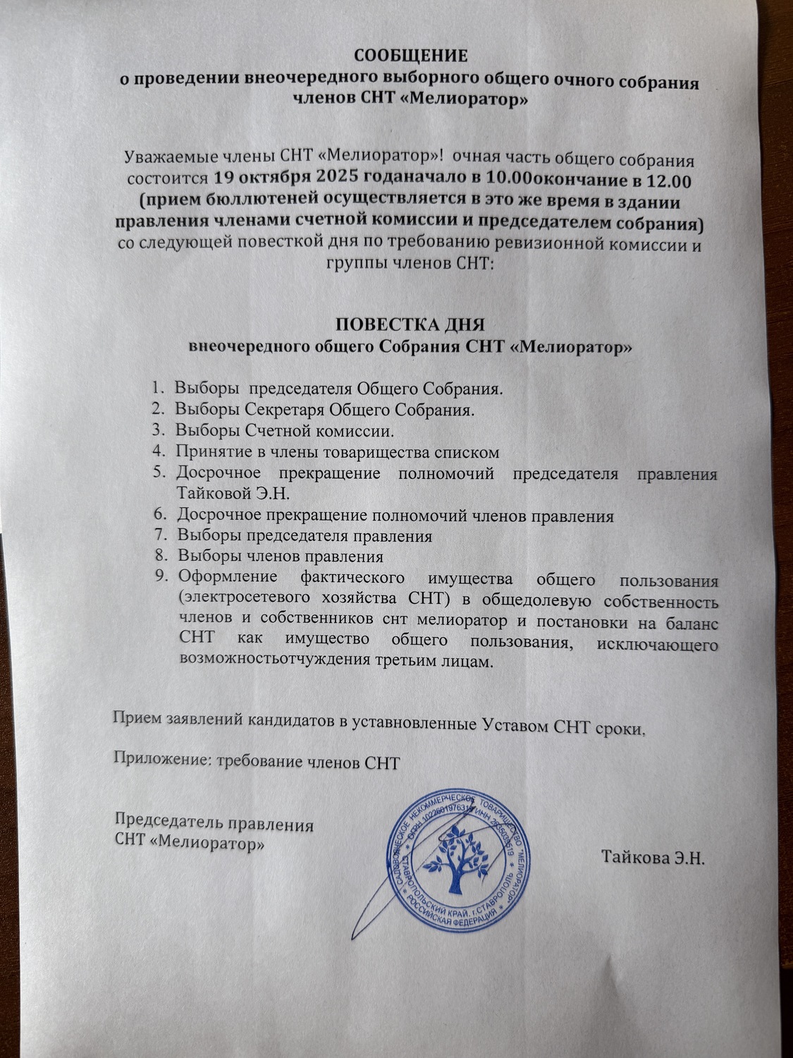 СООБЩЕНИЕ О внеочередном СОБРАНИИ 19 октября 2025г!!!!